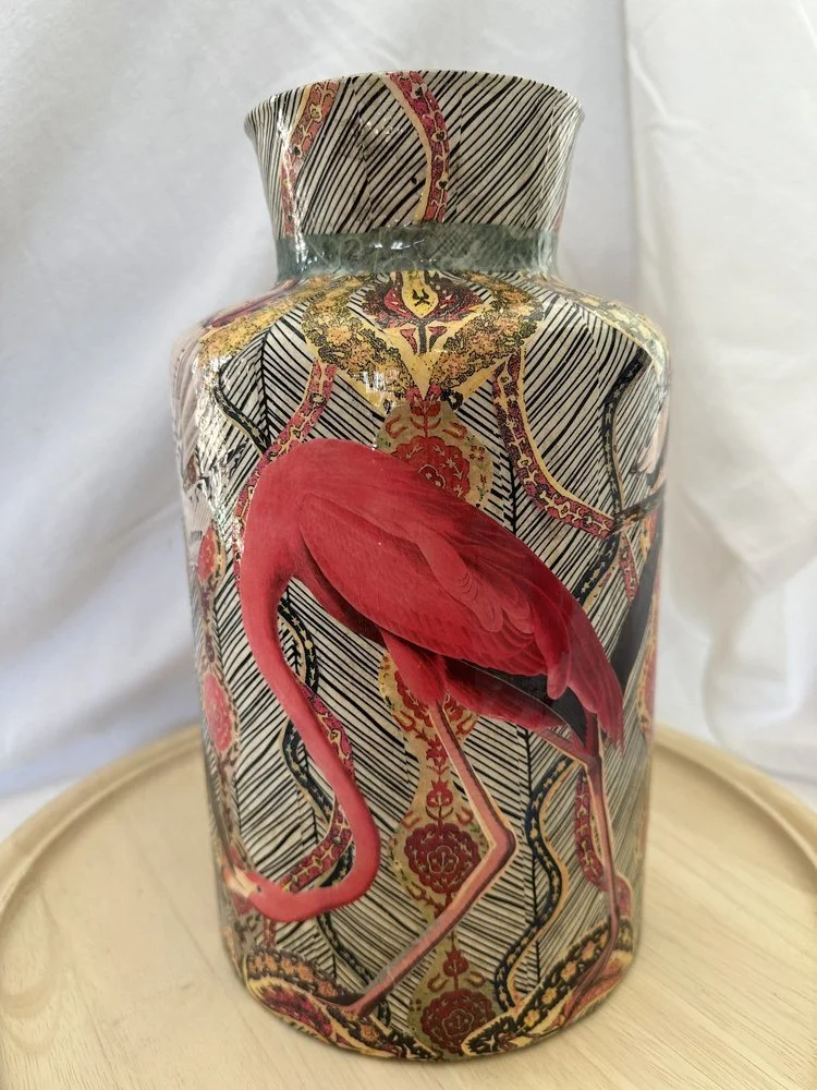 One-of-a-kind, handmade decoupage glass vase featuring an exotic bird motif, over a flowing, vibrant background. Inside is also fully decorated.