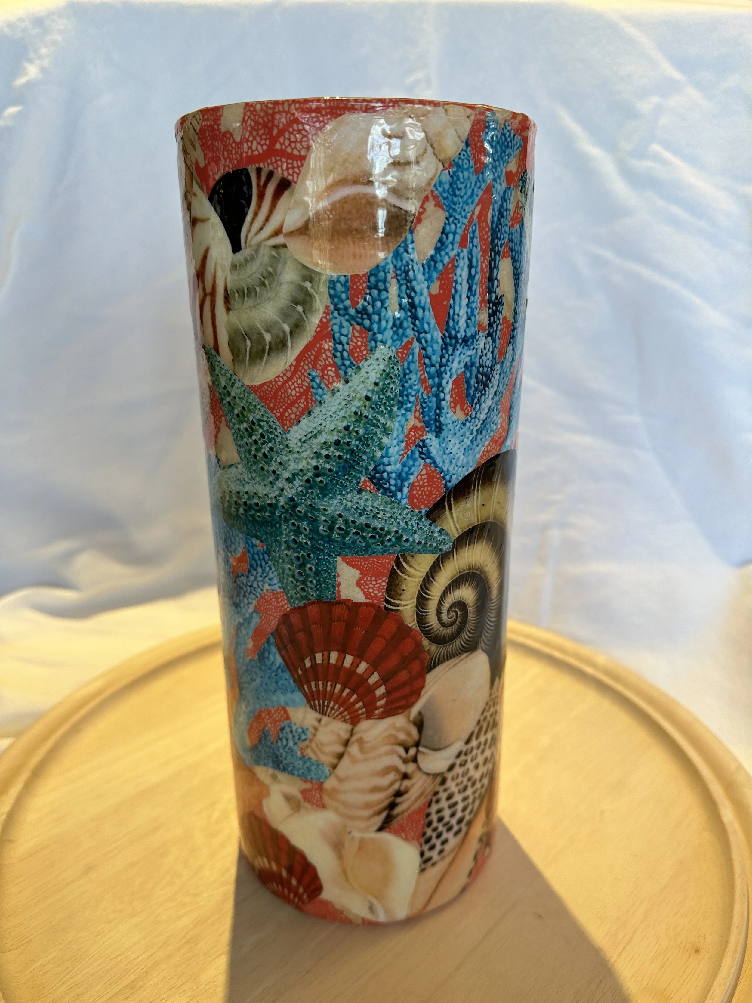 One-of-a-kind, handmade decoupage glass vase featuring a coral and shell motif. Perfect gift if visiting friends at the shore. The vase can be used for flowers or for display. All work is done on the outside of the glass, so water can be added inside.