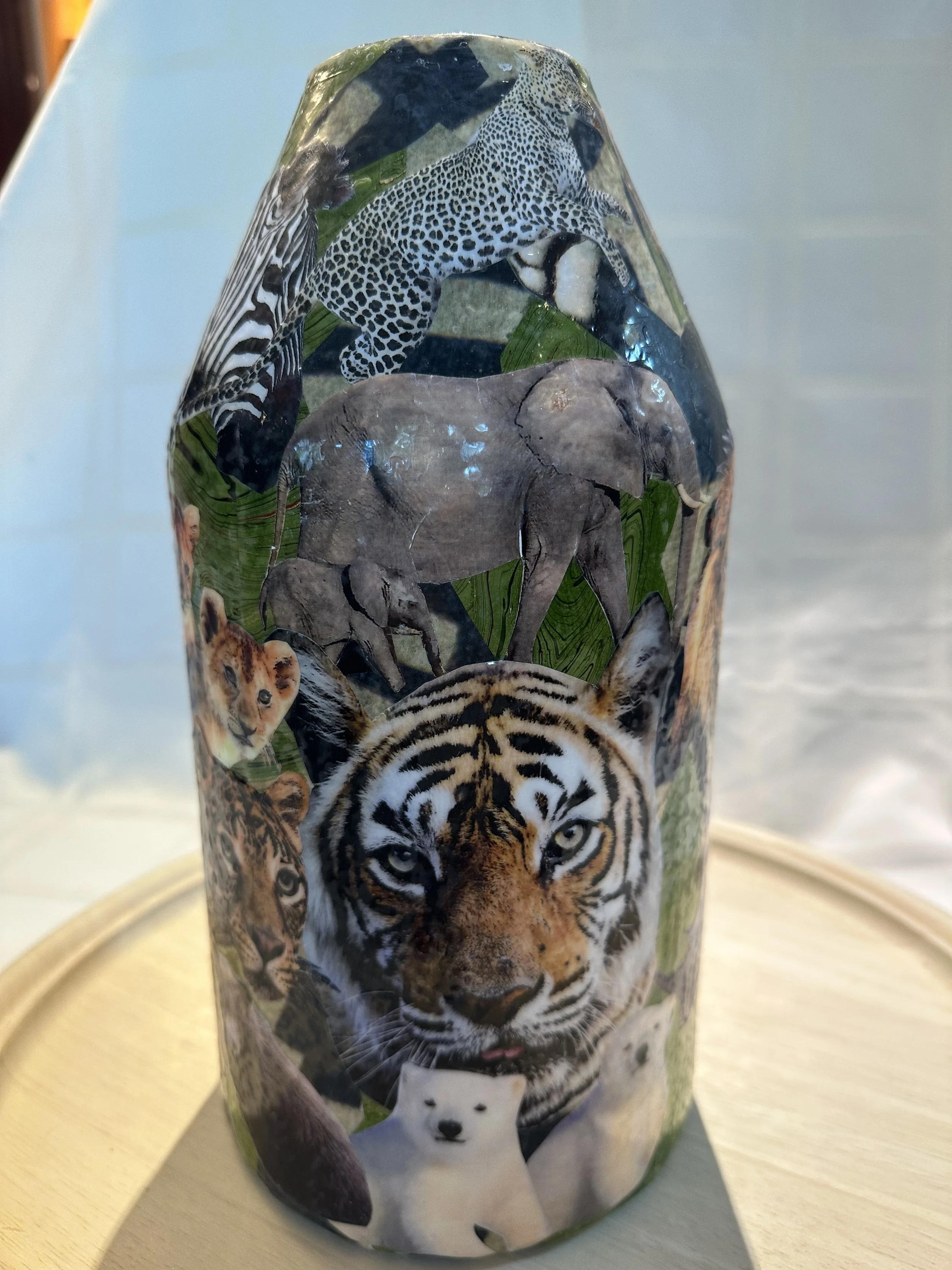 One-of-a-kind, handmade decoupage glass vase featuring a wild animal motif–lions, tigers and (panda) bears... oh my! Look closely inside, and there’s a fun surprise on the inside of the vase.